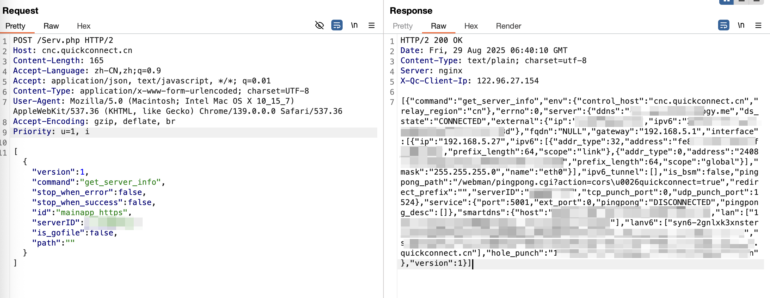 根据上述获得的 serverID,通过 QuickConnect 的 Serv.php 接口可以获得设备的详细信息: